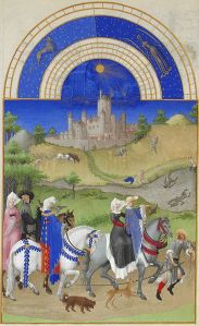Para pasar ese tiempo sin horarios, los hombres y las mujeres medievales se guiaban por los libros de horas, el más conocido de los cuales es del Duque de Berry. Como una novela gráfica, los campesinos y señores desfilan mes a mes, contándonos sus actividades: en la ilustración de arriba, descubrimos que en agosto los señores se dedican a la caza, y que el calor aprieta tanto en la Edad Media como ahora (con permiso del cambio climático): al fondo, unas figuras se zambullen gozosas en un lago de agua fresca.